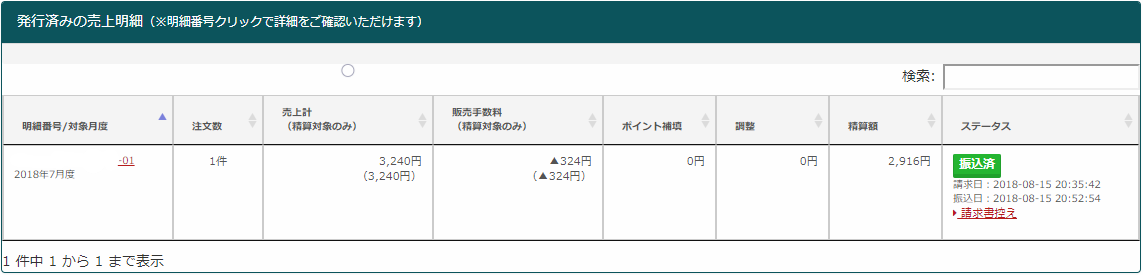 - 売上明細は前月の売り上げ実績を締めて、毎月15日前後に自動的に発行されます。