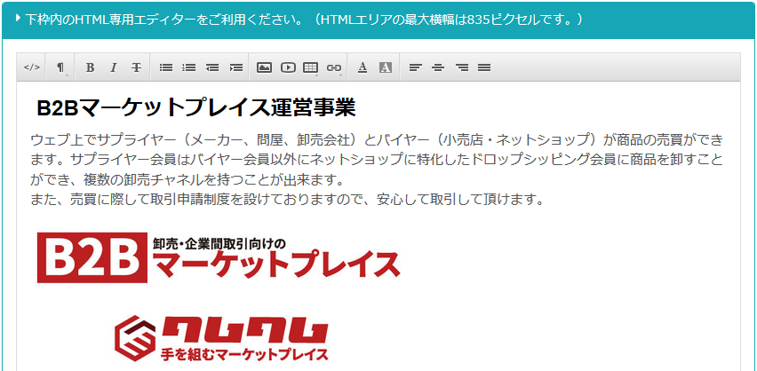 サプライヤー企業ページのHTMLエリアにオリジナルのHTMLを作成することができます。