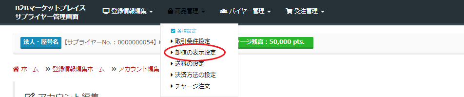 卸値の表示設定 サプライヤー管理画面の「取引条件の設定」をクリックします。 ここでは、卸値の表示設定を行います。 全バイヤーに卸値を表示する サプライヤー側の取引承認の有無に関わらず、卸値を表示します。 取引承認済みのバイヤーにのみ卸値を表示する サプライヤーが承認したバイヤーにのみ卸値を表示します。